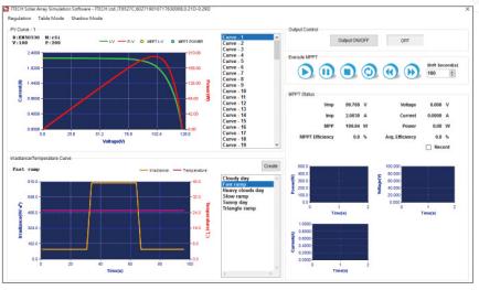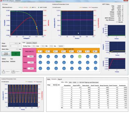 ITECH高速高性能光伏/太阳能仿真电源拥有图形化的操作界面,用户可非常容易地使用软件去实时输出、量测、显示光伏逆变器的最大功率追踪状况及数值记录。内置EN50530、Sandia等5种法规测试程序,方便用户测试光伏逆变器的静态和动态 MPPT效能,并生成报表,以便与竞争对手的结果进行比较。还提供了shadow和Table模式,用户可以输入128~4096点的矩阵去编辑任何屏蔽的I-V曲线实现动态云遮效果,也可以存储100条不同光照、温度下的I-V曲线来测试光伏逆变器在不同气候条件下的长时间最大功率追踪效能。