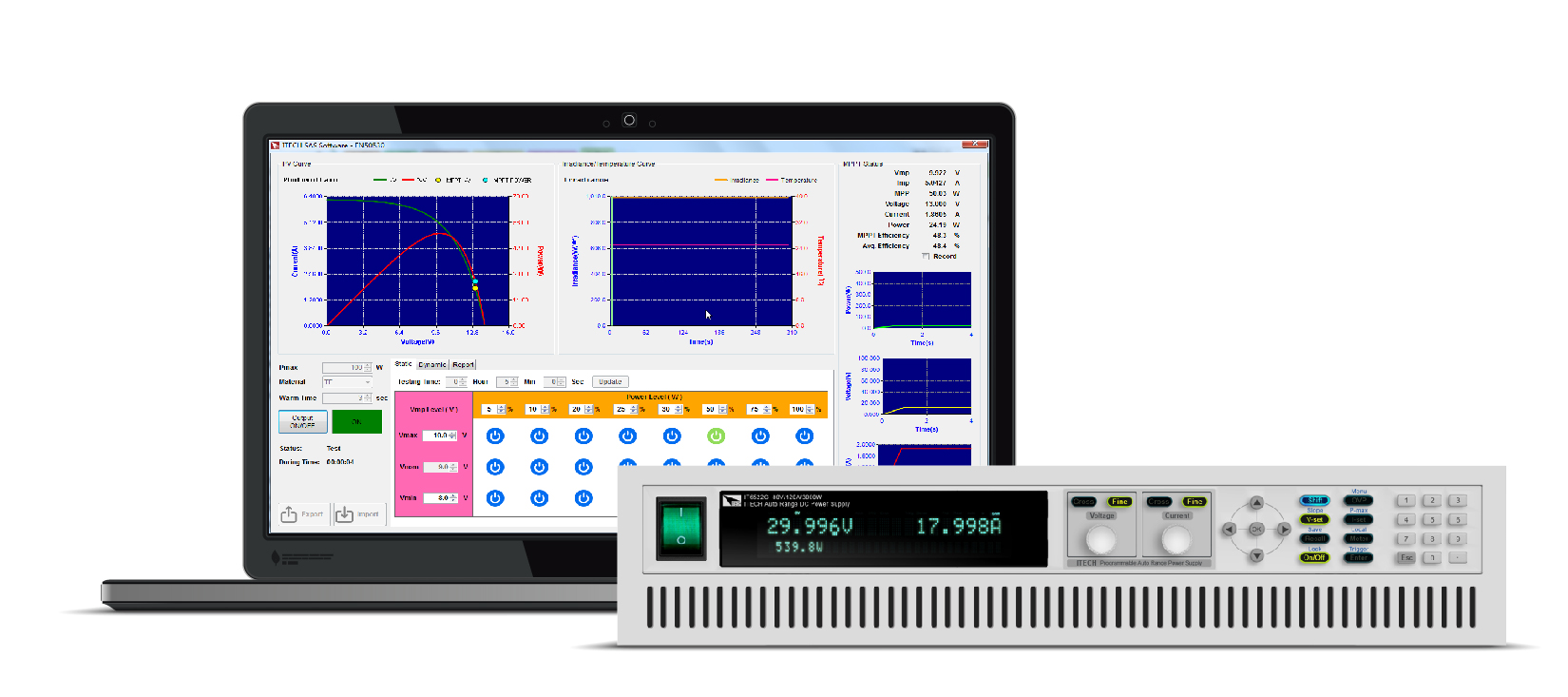 由于太阳能电池利用率不仅与其内部特性有关,还受到天气、季节、温度、照度、云遮、下雨和下雪等因素的影响,在不同的时段会具有不同的I-V特性。因此光伏逆变器必须具备应对策略,实时调整太阳能电池的工作点,使之始终工作在最大功率点附近,这一过程就称之为最大功率点跟踪MPPT。ITECH高速高性能光伏/太阳能仿真电源可以在实验室的测试环境下,去直接模拟各种真实条件下的太阳能电池阵列,从而测试光伏逆变器的静态 & 动态最大功率点追踪效能。