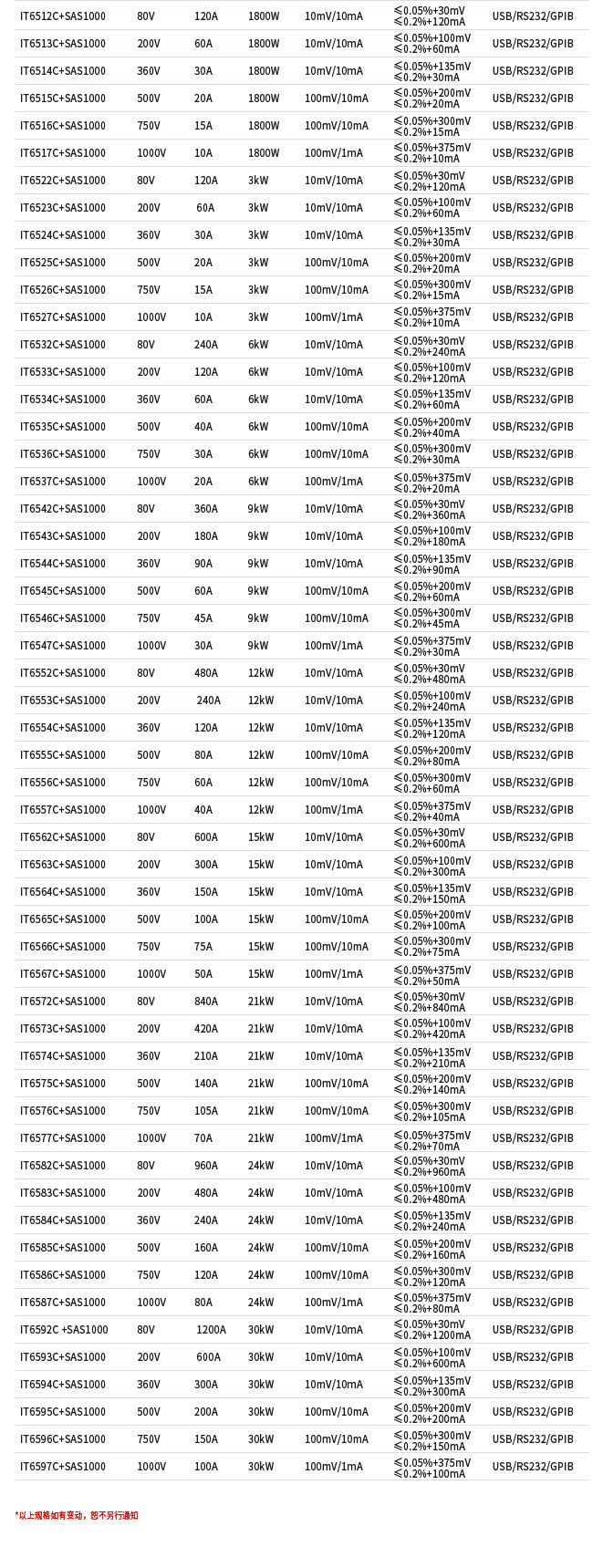 ITECH高速高性能光伏/太阳能仿真电源,采用IT6500C高速高性能大功率直流电源搭载SAS1000太阳能电池矩阵仿真软件实现,全系列共有54个机型,输出可达1000V、1200A,拥有超宽的电压、电流使用范围,一台机器即可涵盖广阔的应用需求,便于用户轻易的选择所需要的机型。支持各种模式下边沿时间独立设定,具有双向限电流无缝切换功能,同时支持OVP、OCP、OPP、OTP,Vsense反接等多种保护功能。